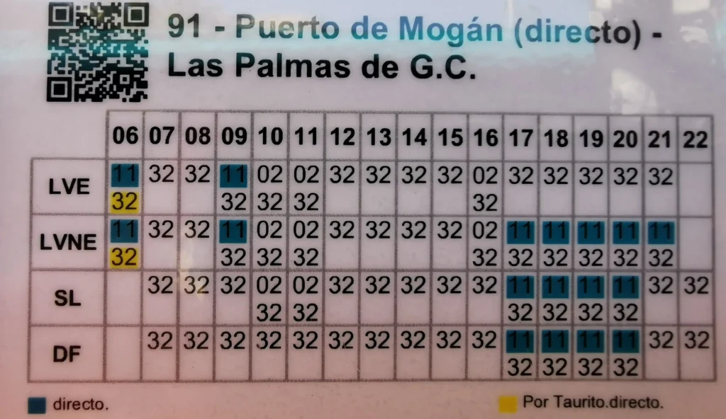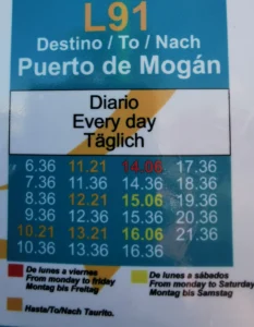 1. Bus: The direct Global bus (line 91) runs from the airport to Puerto Rico hourly. Travel time is around 45 min and the cost is €5.5 per person. Buses run from 6:30 am early until 9:30 pm. For ealier or later travel, Line 1 is possible, but it takes more than 1,5 hours to get to Puerto Rico. Check the schedules for Line 91 from Airport and from Puerto Rico.